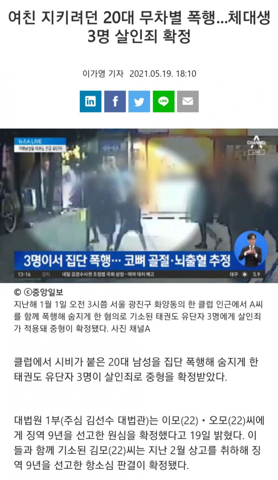 여친 지키려던 20대 무차별 폭행해서 사망..