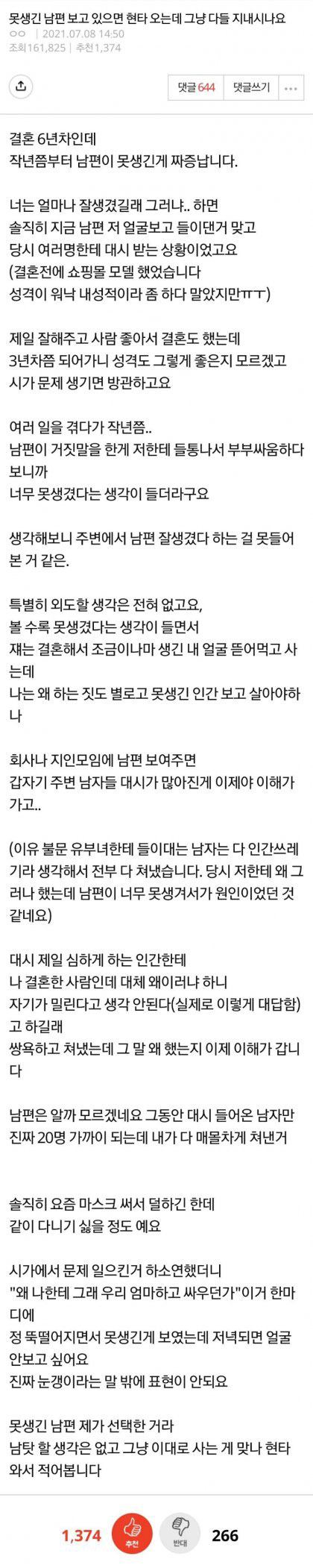 남편이 못생겨서 현타 온다는 유부녀